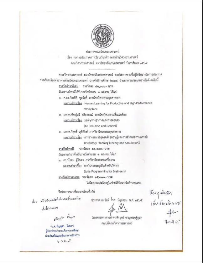 ในการประกวดการเรียบเรียงตำราทางด้านวิศวกรรมศาสตร์ จัดโดยคณะวิศวกรรมศาสตร์ มหาวิทยาลัยเกษตรศาสตร์
